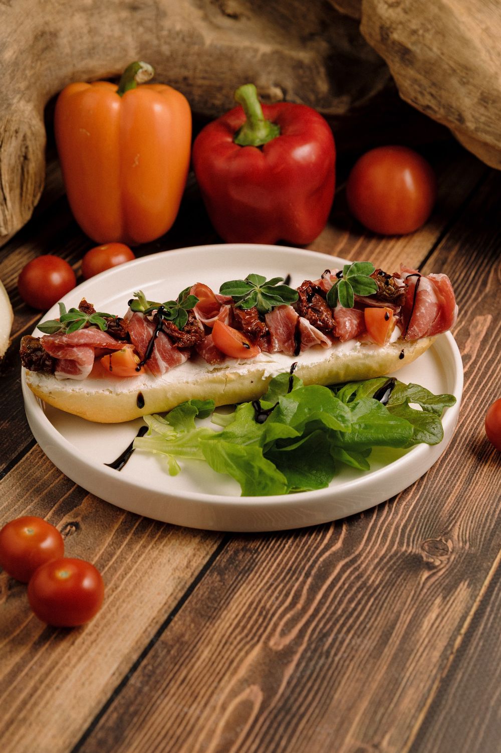 Минибагет, творожный сыр, свинина сыровяленая, томат черри, вяленый томат, горчица французская