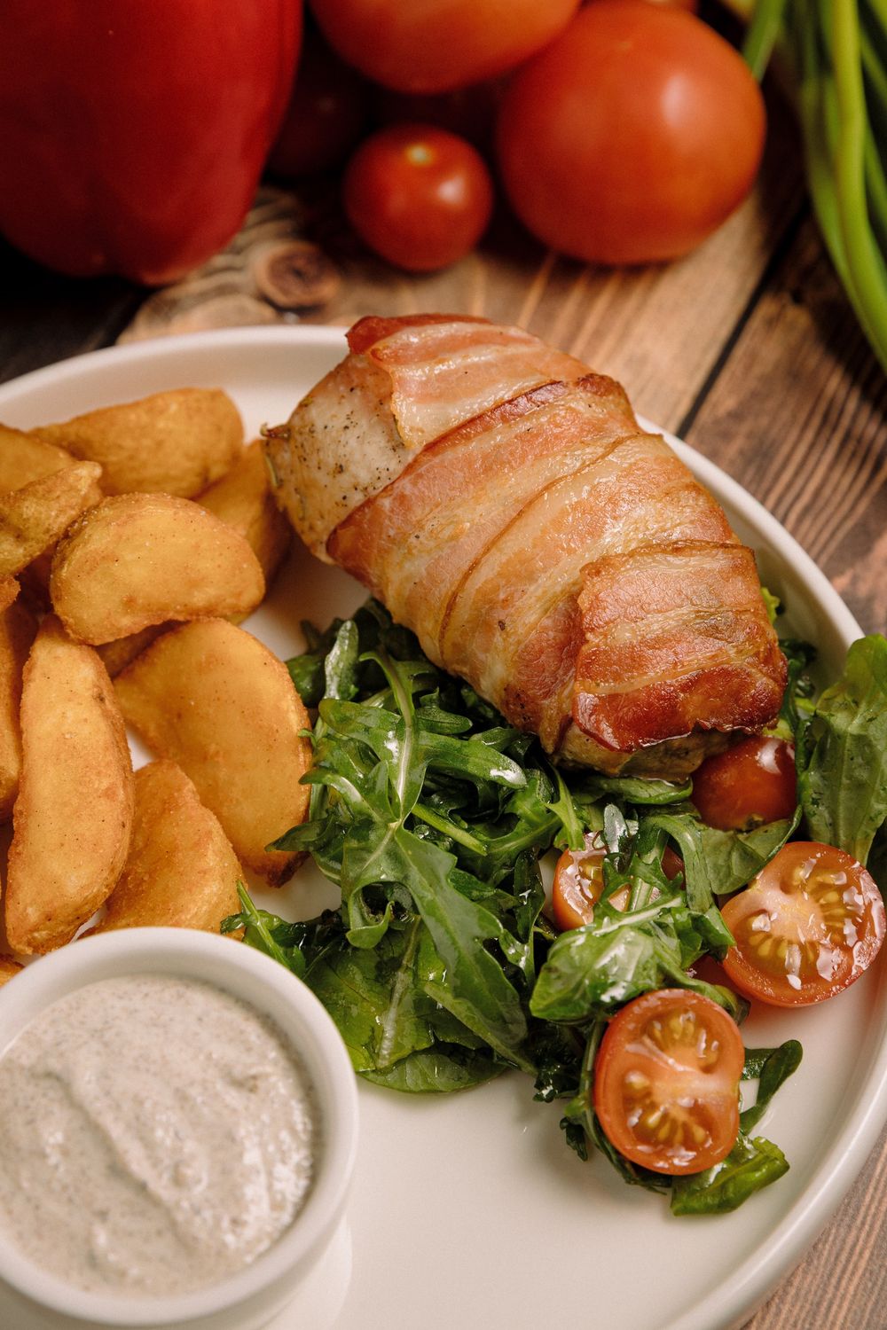 Свиная вырезка в беконе с грибным соусом и картофельными дольками