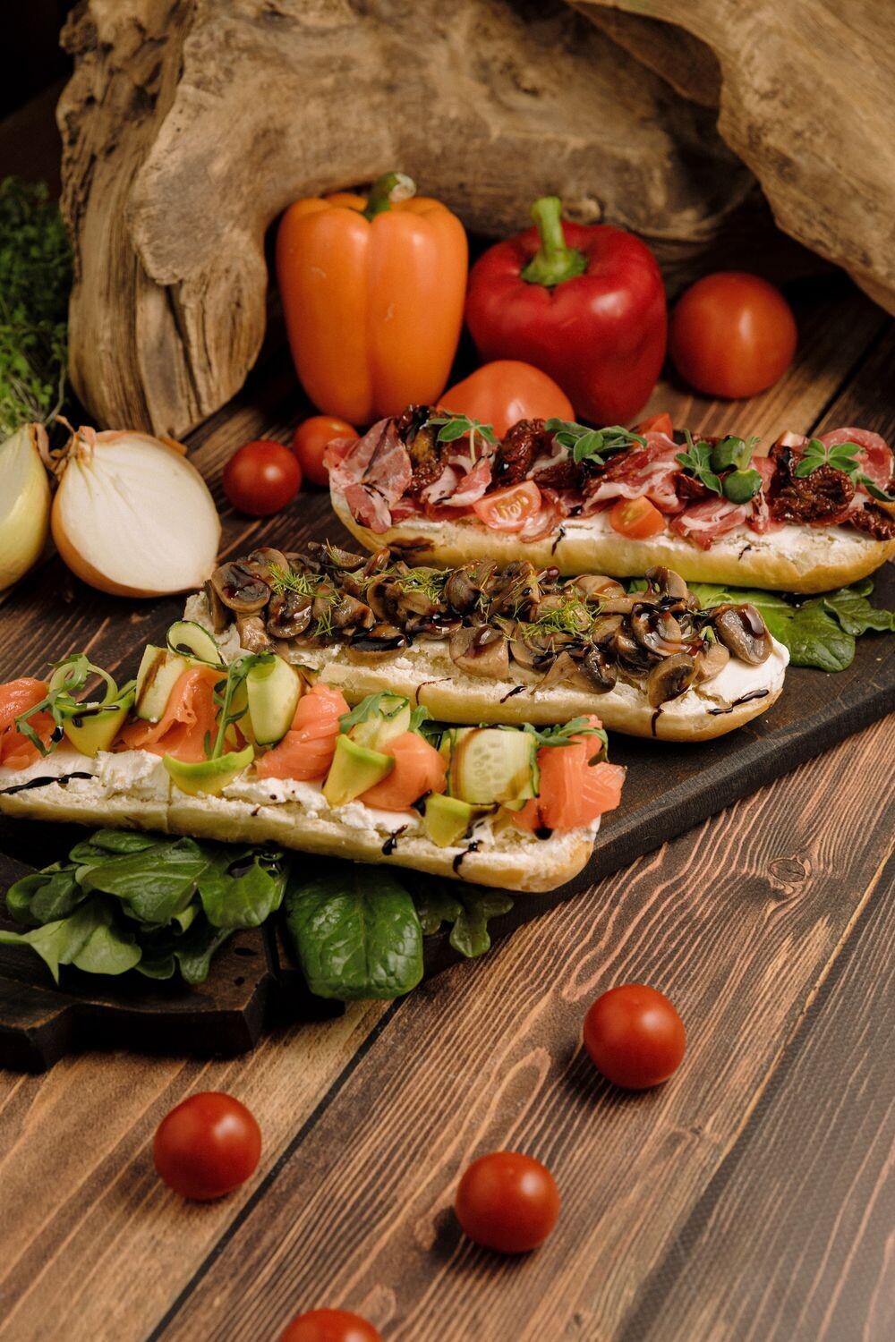 Брускетта с копчёным мясом и вялеными томатами Брускетта с жареными шампиньонами и творожных сыром Брускетта с лососем, авокадо и творожным сыром